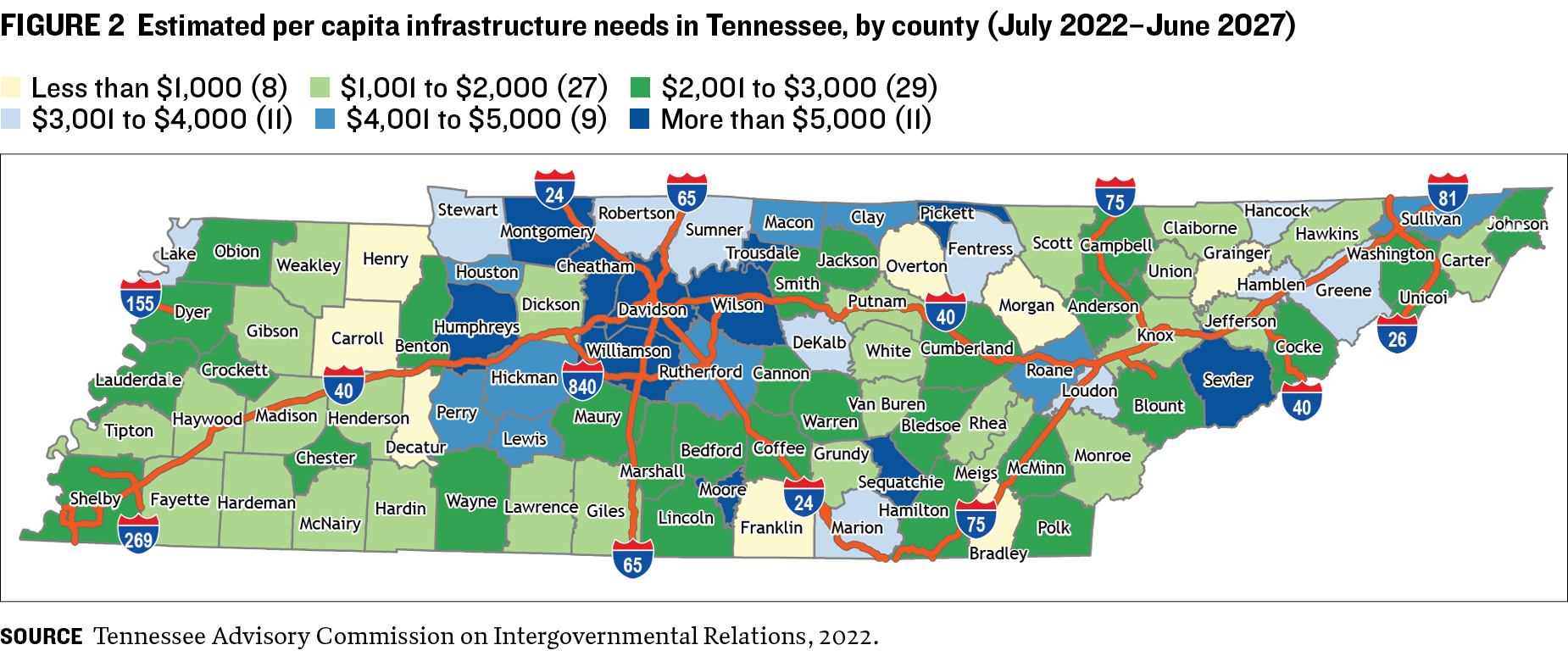In addition to this information, states should consider disclosing needs by geographic area. Several are already including some geographic information in their reports. For instance, Hawaii discloses the island where the deferred maintenance need is located but does not report the total deferred maintenance costs by island. Similarly, Tennessee discloses infrastructure needs by county (as required per policy) in a table format (that includes county totals) and a visual representation (of both total needs and per capita needs—figure 2).