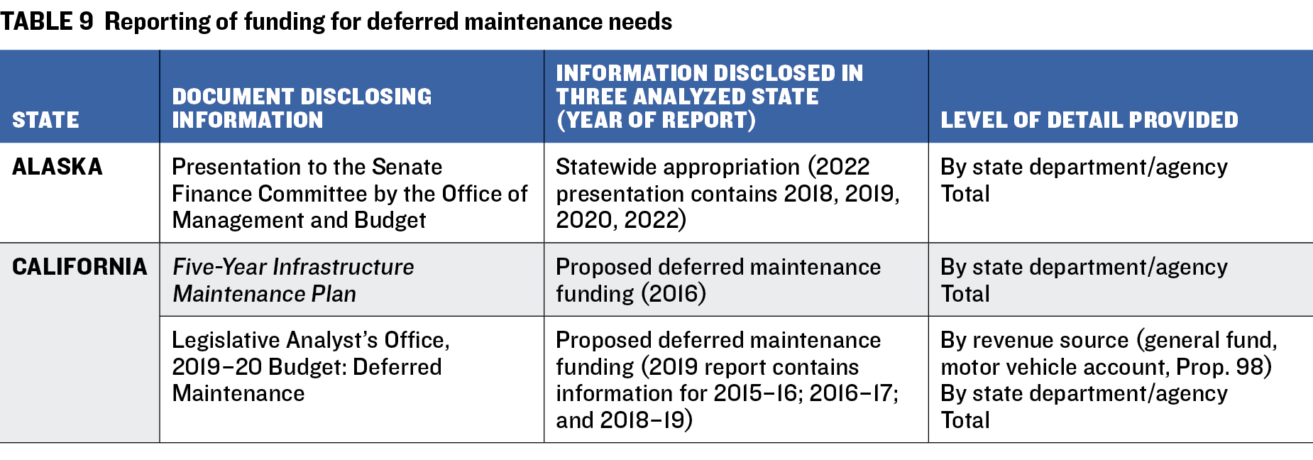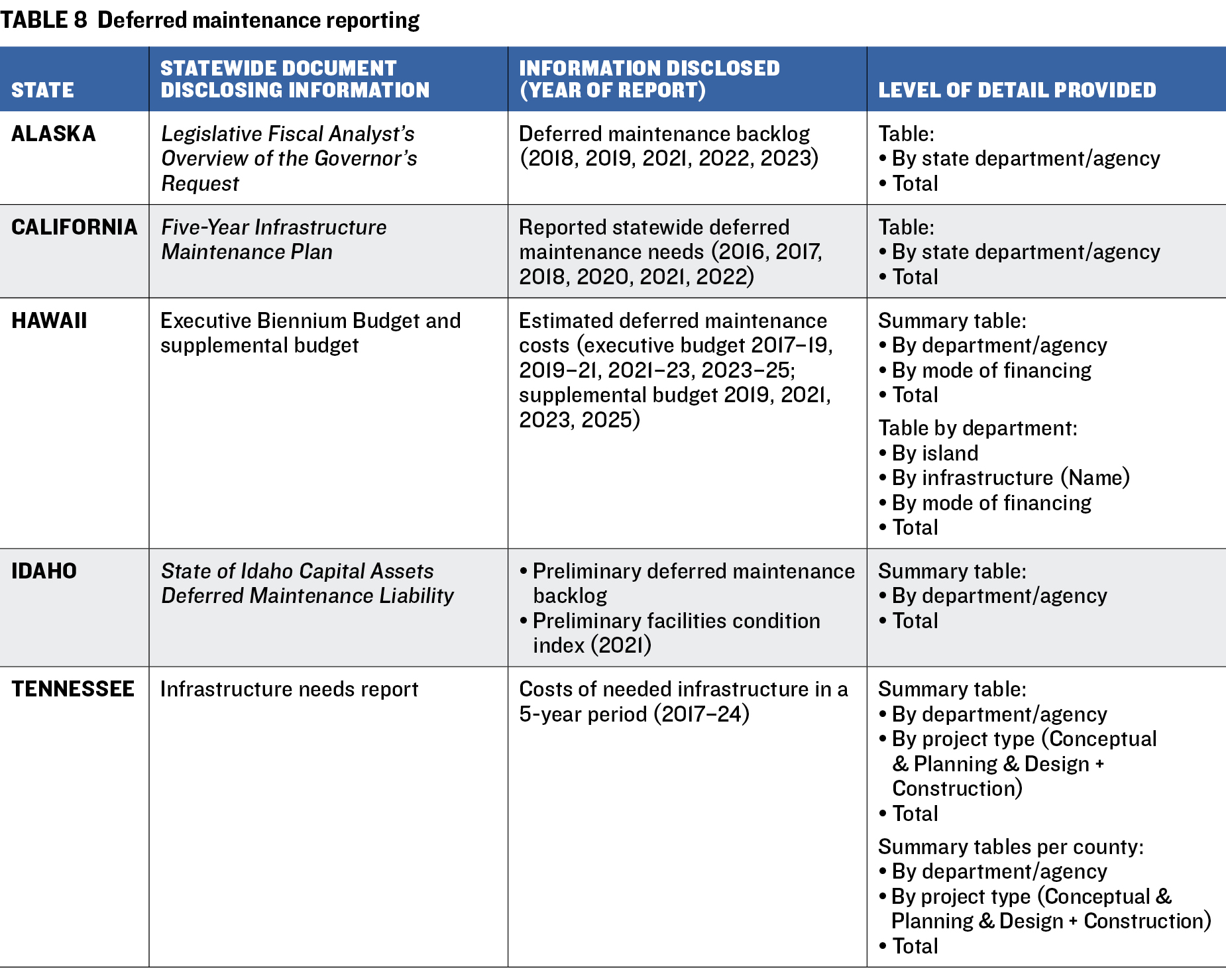 e. Other methods that affect the value of deferred maintenance needs (such as infrastructure that is removed from service or disposed of). None of the analyzed states currently utilizes this practice. Table 8 presents the reports used by five analyzed states to report deferred maintenance needs and a description of the level of detail provided. The states typically report deferred maintenance needs in a table that discloses needs by department and presents the total amount of deferred maintenance for the year of reporting.